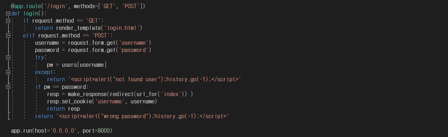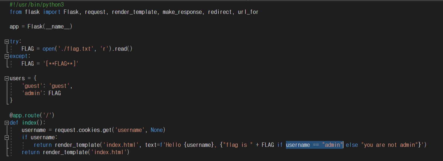 username을 가져와서 "admin" 이면 FLAG를 출력하고 아니면 "you are nat admin"을 출력합니다.
