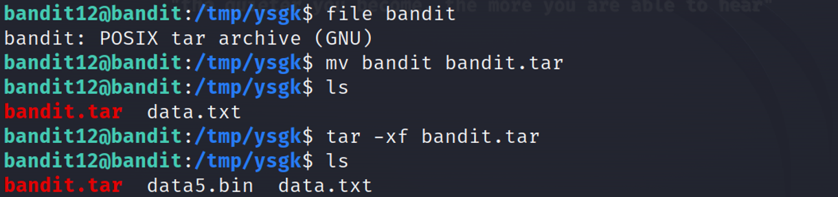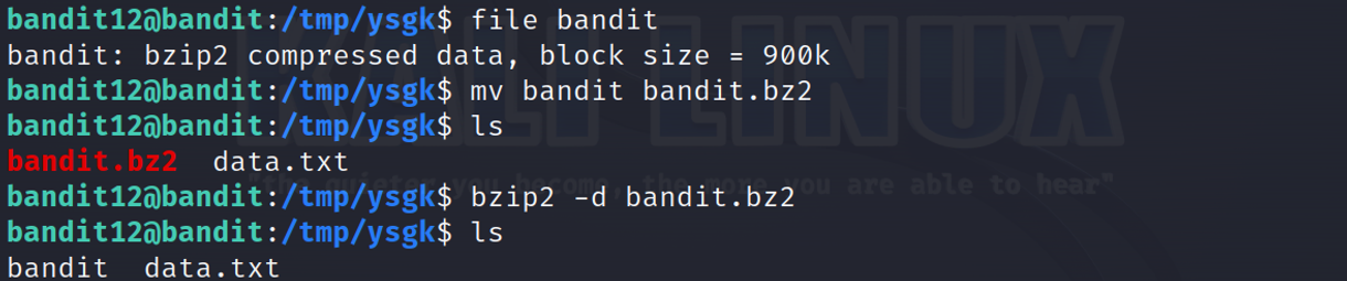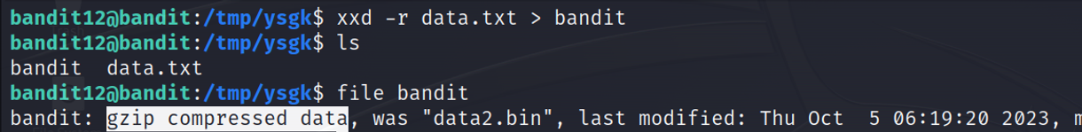 xxd -r 명령어를 사용하여 data.txt를 이진 데이터로 바꾼 뒤 bandit 이라는 이름으로 저장합니다.
