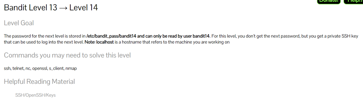 - 문제설명: PW는 /etc/bandit_pass/bandit14에 저장되어 있으며 bandit14 user만 읽을 수 있다. 이 단계에서 다음 PW를 직접 제공하지는 않지만, 다음 단계에 로그인할 수 있는 개인 SSH 키를 얻을 수 있다.