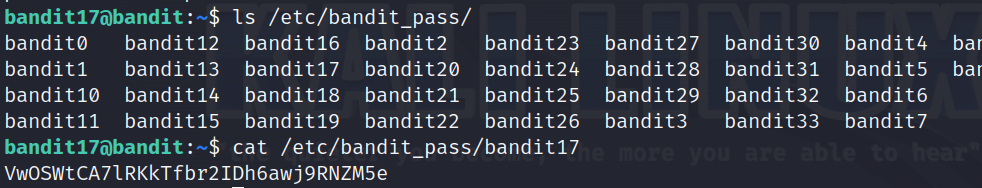 /etc/bandit_pass 의 bandit17 파일을 읽어주면 PW가 나옵니다.