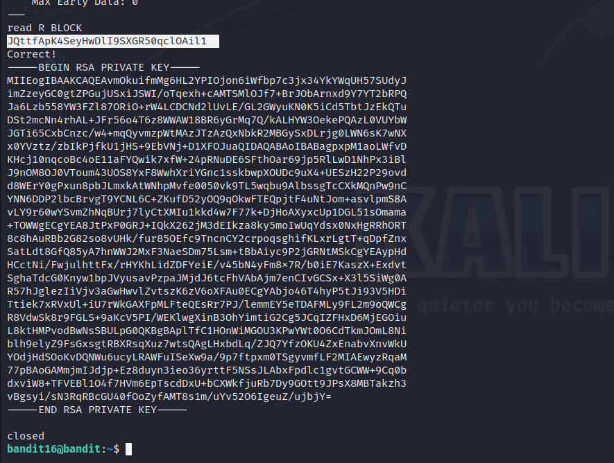 다음 단계의 PW가 나올 줄 알았는데 Correct! 문자가 나오고 RSA private 가 출력된 뒤 종료됩니다.