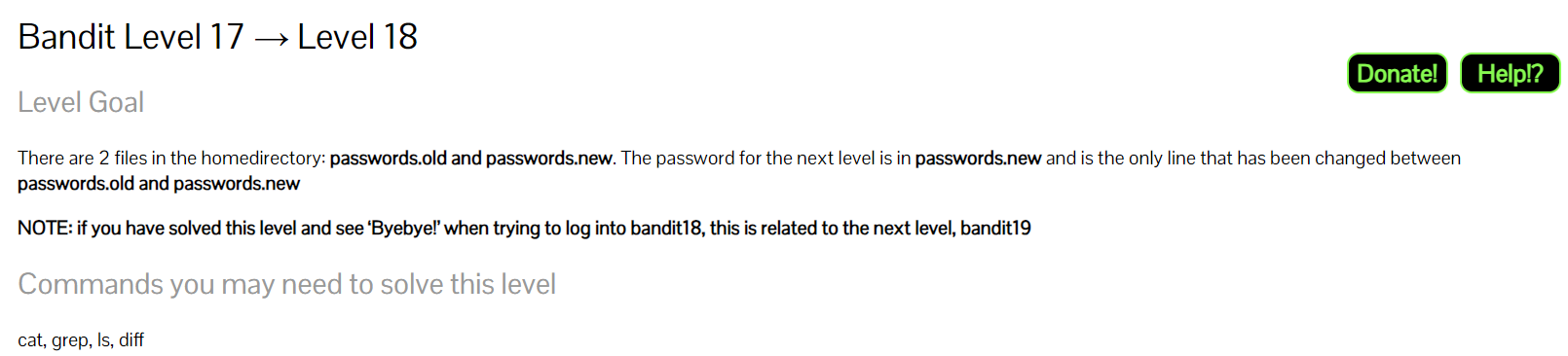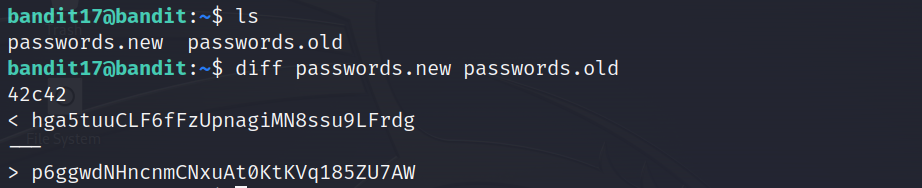 - 문제설명: home dir에 passwords.old와 passwords.new 두 개의 파일이 있습니다. PW는 passwords.new에 있으며 두 파일 사이에 변경된 한 줄에 있습니다 ( 참고: bandit18을 풀고 bandit18에 로그인할 때 'Byebye!' 메세지가 표시되면 이것은 bandit19와 관련된 것입니다)
