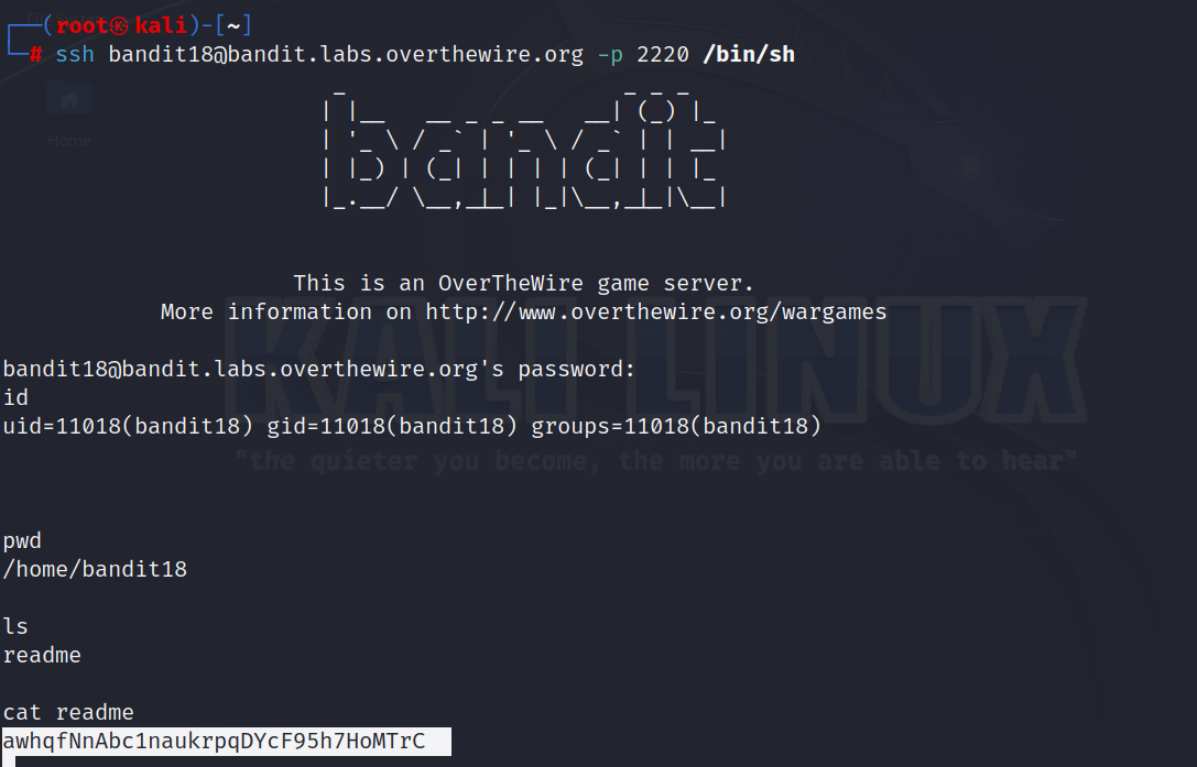 # ssh bandit18@bandit.labs.overthewire.org -p 2220 /bin/sh