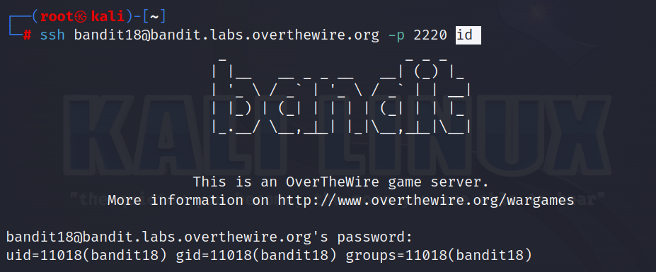 # ssh bandit18@bandit.labs.overthewire.org -p 2220 id