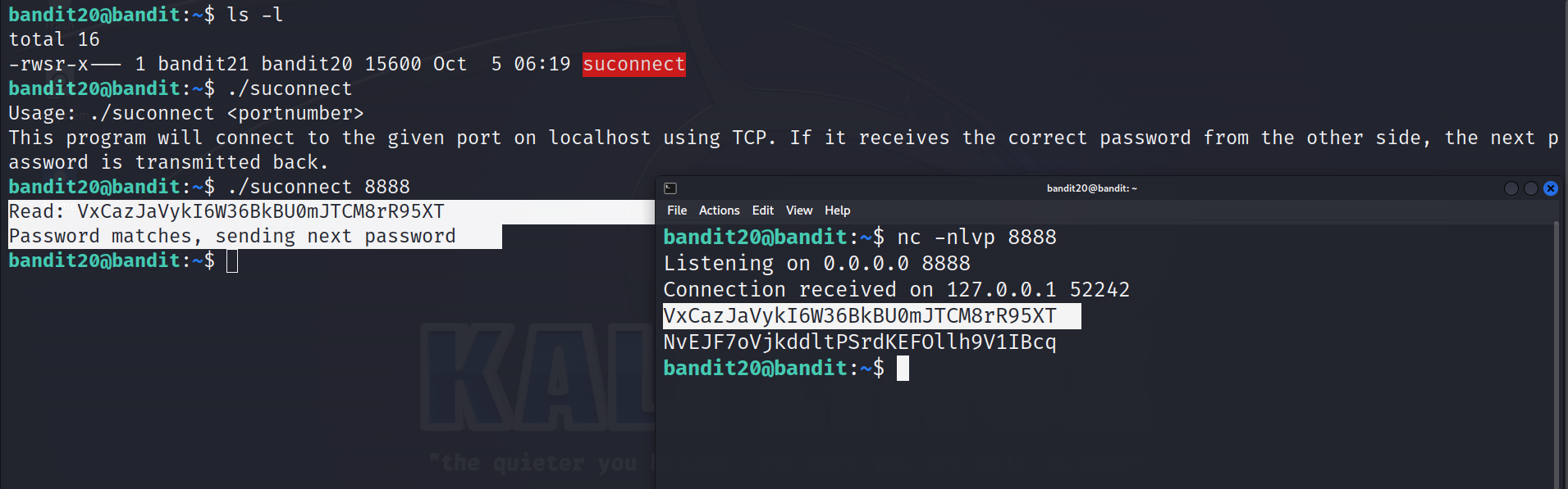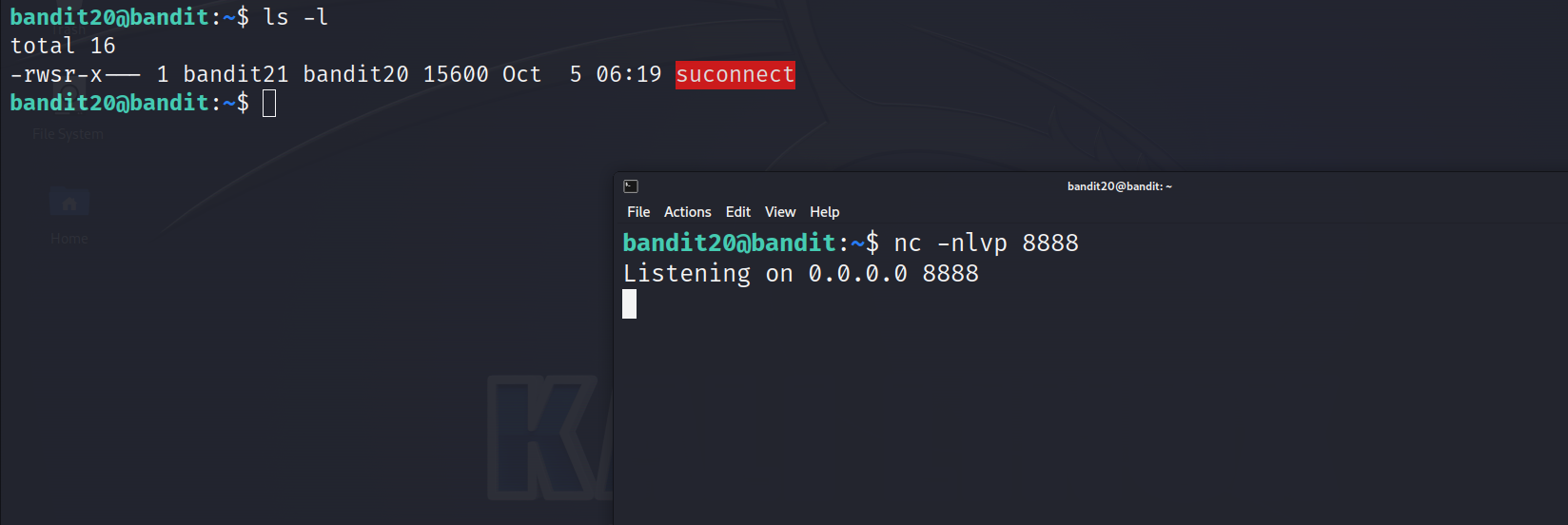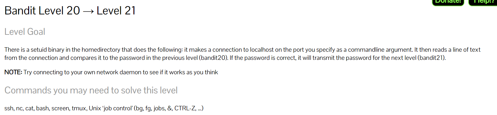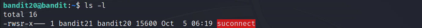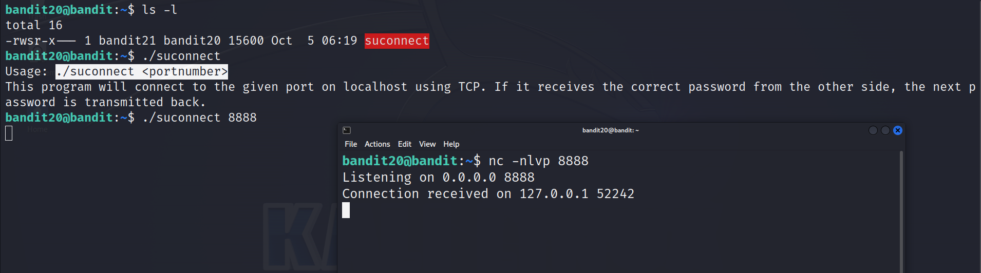 - 문제설명: home dir에 setuid 바이너리가 있다. 이것은 지정한 포트(localhost에서)를 연결해서 한 줄의 텍스트를 읽어 온다. 텍스트가 이전 레벨의 비밀번호 (bandit20)이면 다음 레벨 (bandit21)의 비밀번호를 전송한다.