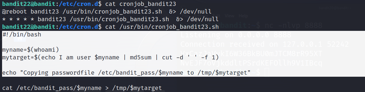 - /etc/bandit_pass/bandit23 의 내용을 /tmp/$mytarget에 복사합니다.