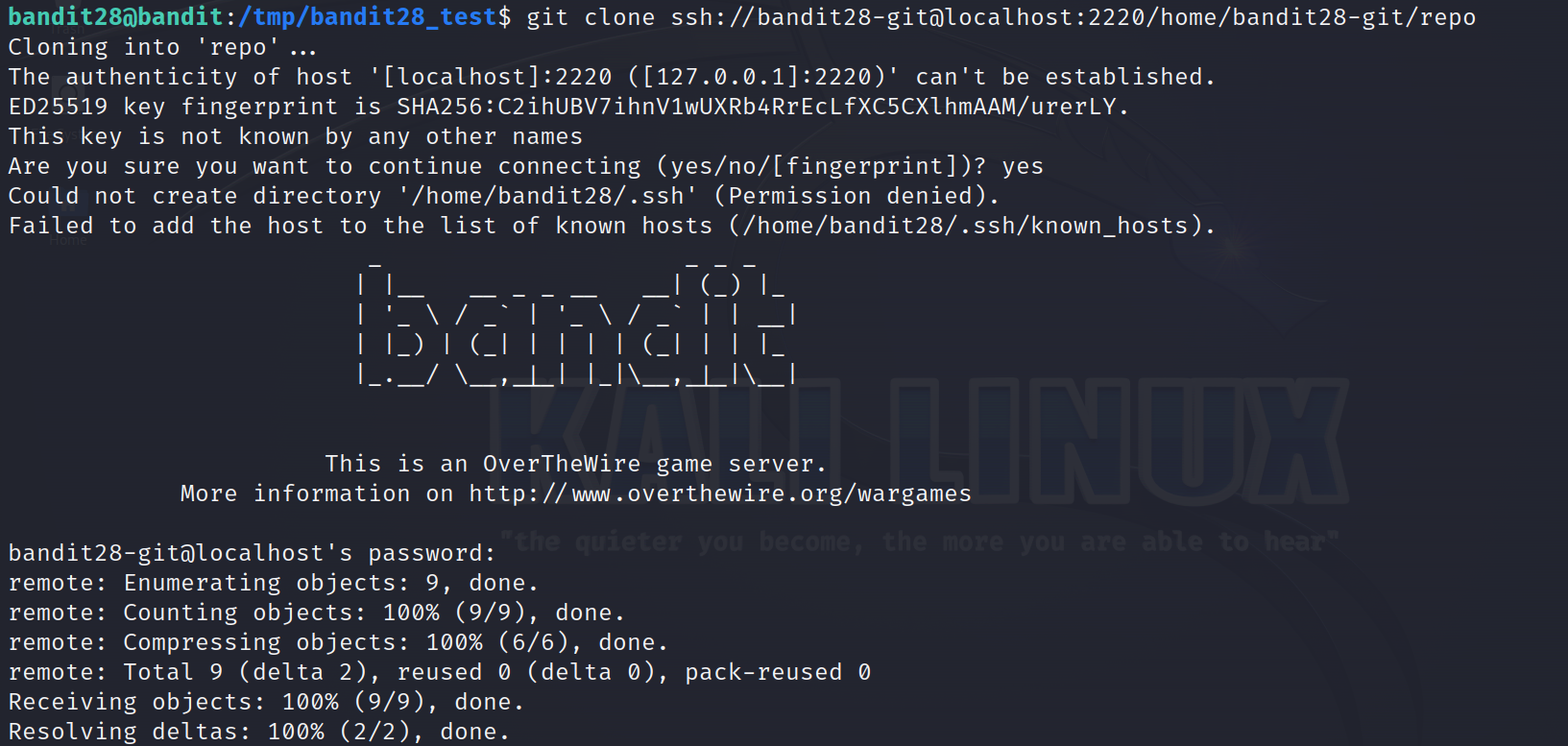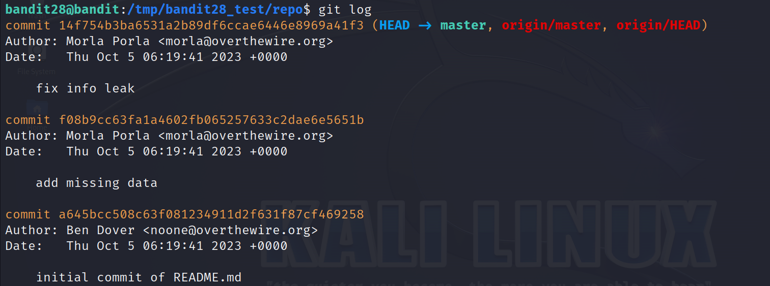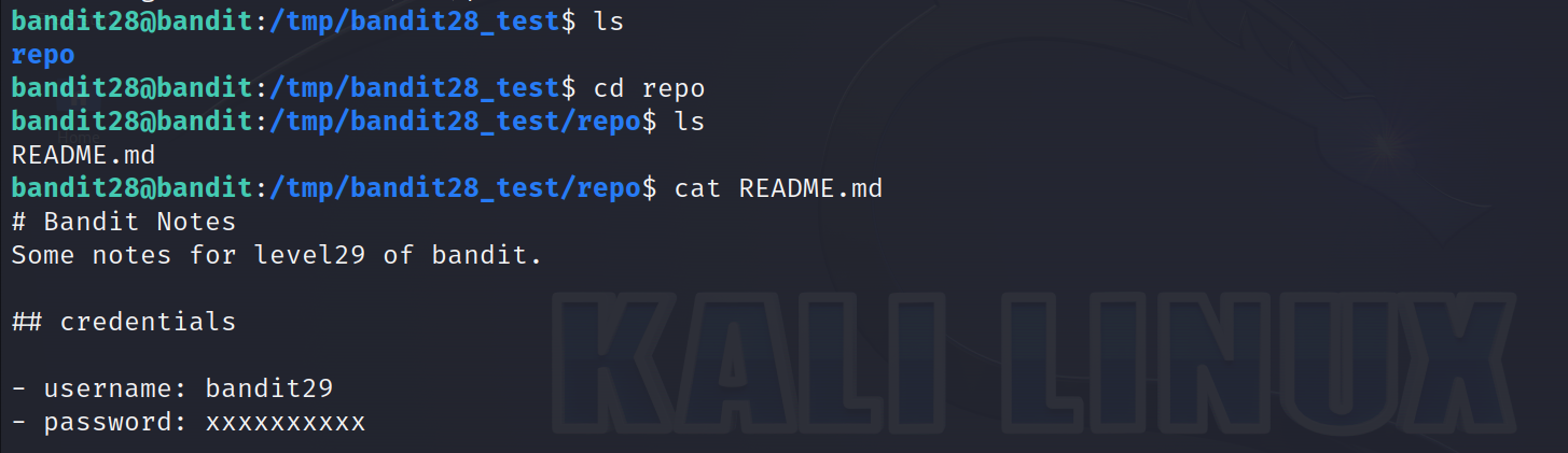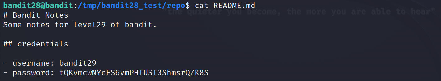 이전 단계와 똑같이 /tmp 에 bandit28_test 라는 폴더를 하나 만들고 git 저장소를 복사하겠습니다.