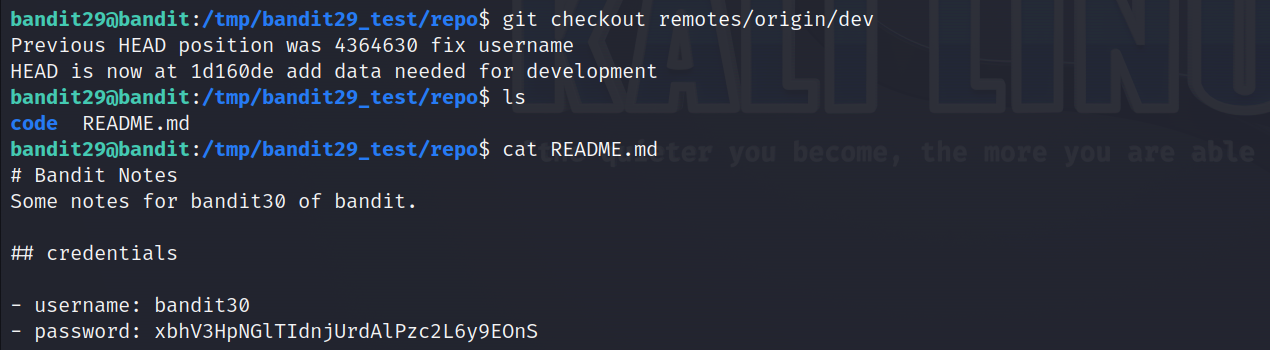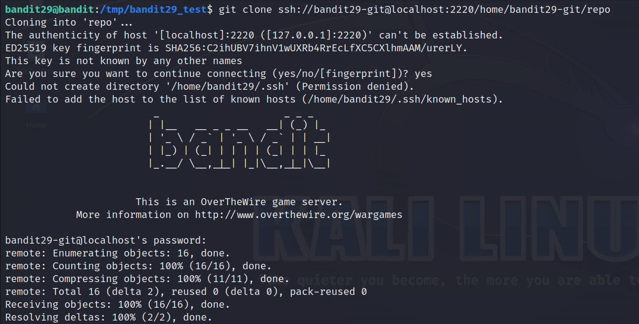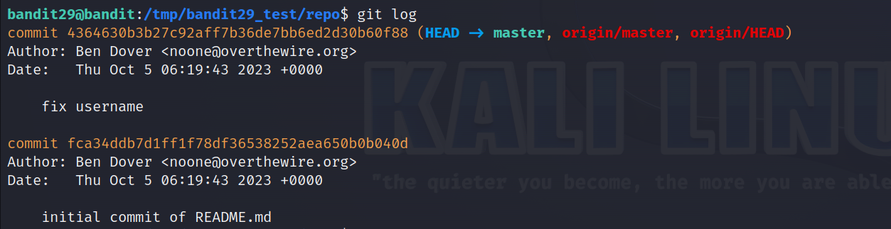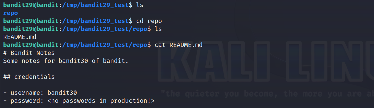 이전 두 단계와 똑같이 /tmp에 bandit29_test라는 dir을 만들고 git clone을 실행합니다.