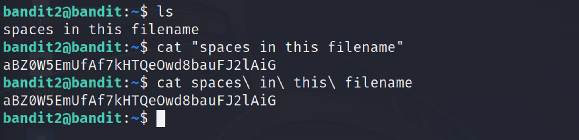 - 문제설명: home dir 에 이름이 'spaces in this filename' 인 파일 안에 다음 PW가 있다.