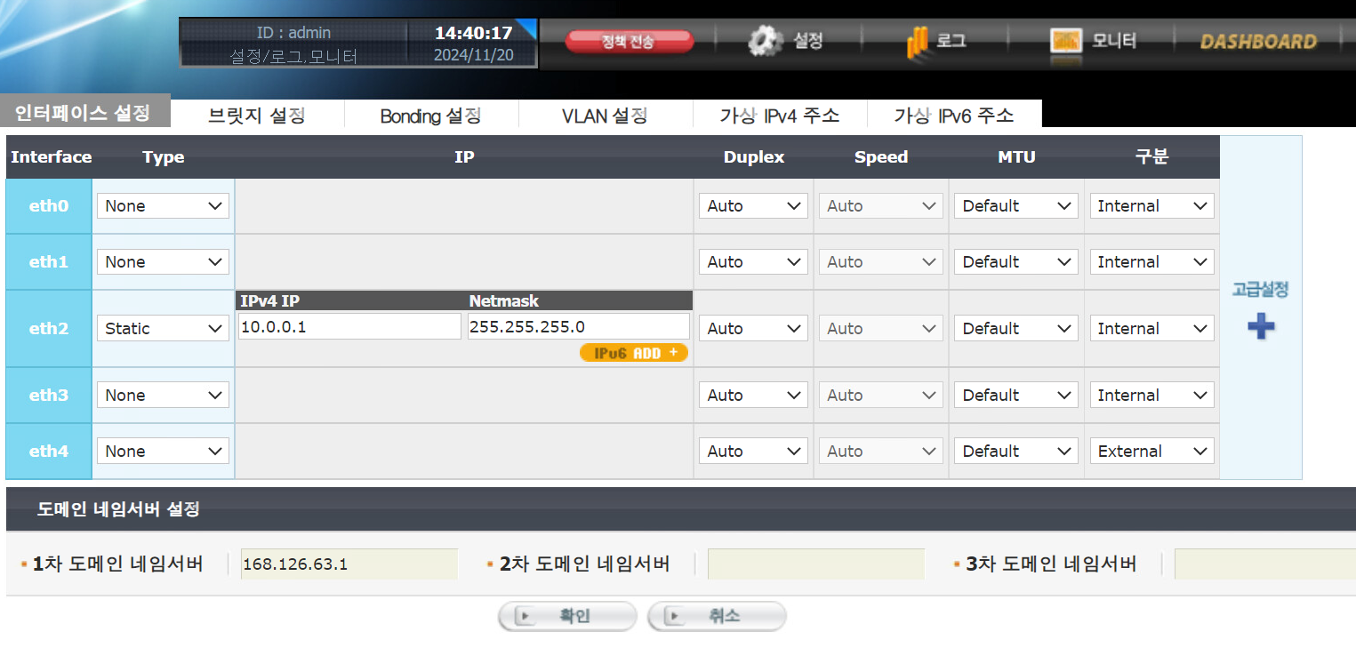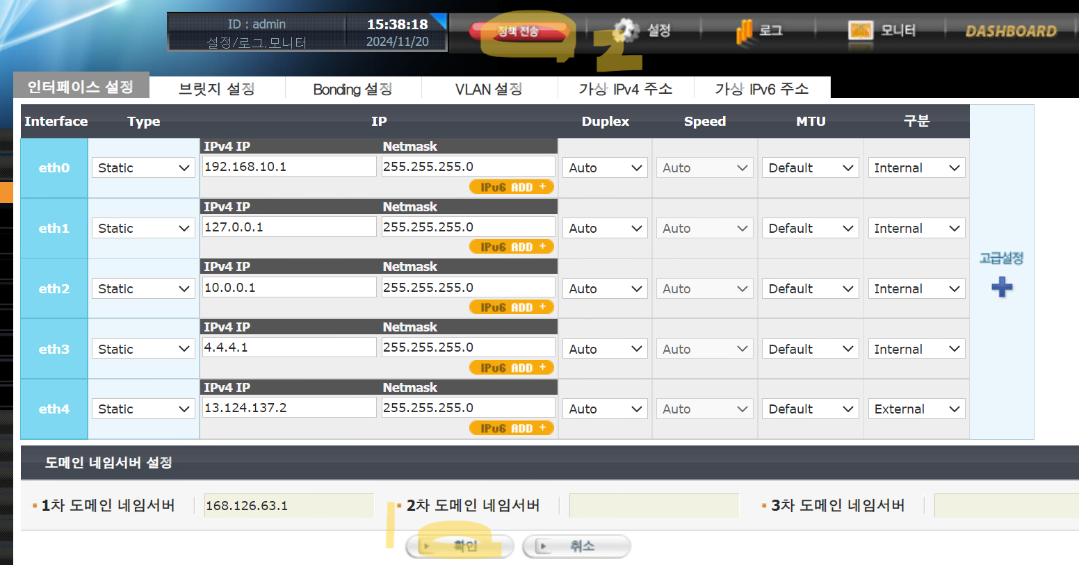 상단의 표를 바탕으로 인터페이스 설정을 추가한 뒤, 확인 버튼을 먼저 누르고 정책 전송 버튼을 눌러 수정사항 반영