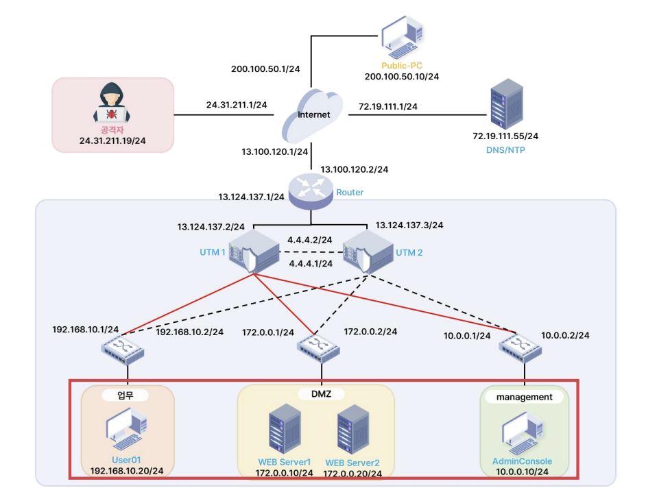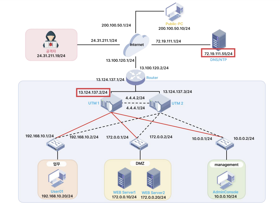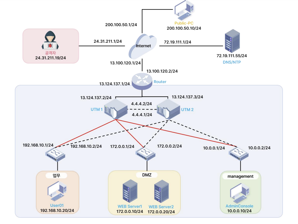 Internet을 중심으로 공격자, 일반사용자, DNS와 NTP서버, 기업망까지 총 4개로 구성. 기업망은 라우터를 기점으로 UTM 두 대가 이중화로 구성되어 있으며, 각 UTM은 라우터와 통신할 수 있는 IP, 이중화 HA를 위한 IP, 기업 내부에 있는 업무망, DMZ망, 관리망에 연결되어 있음.