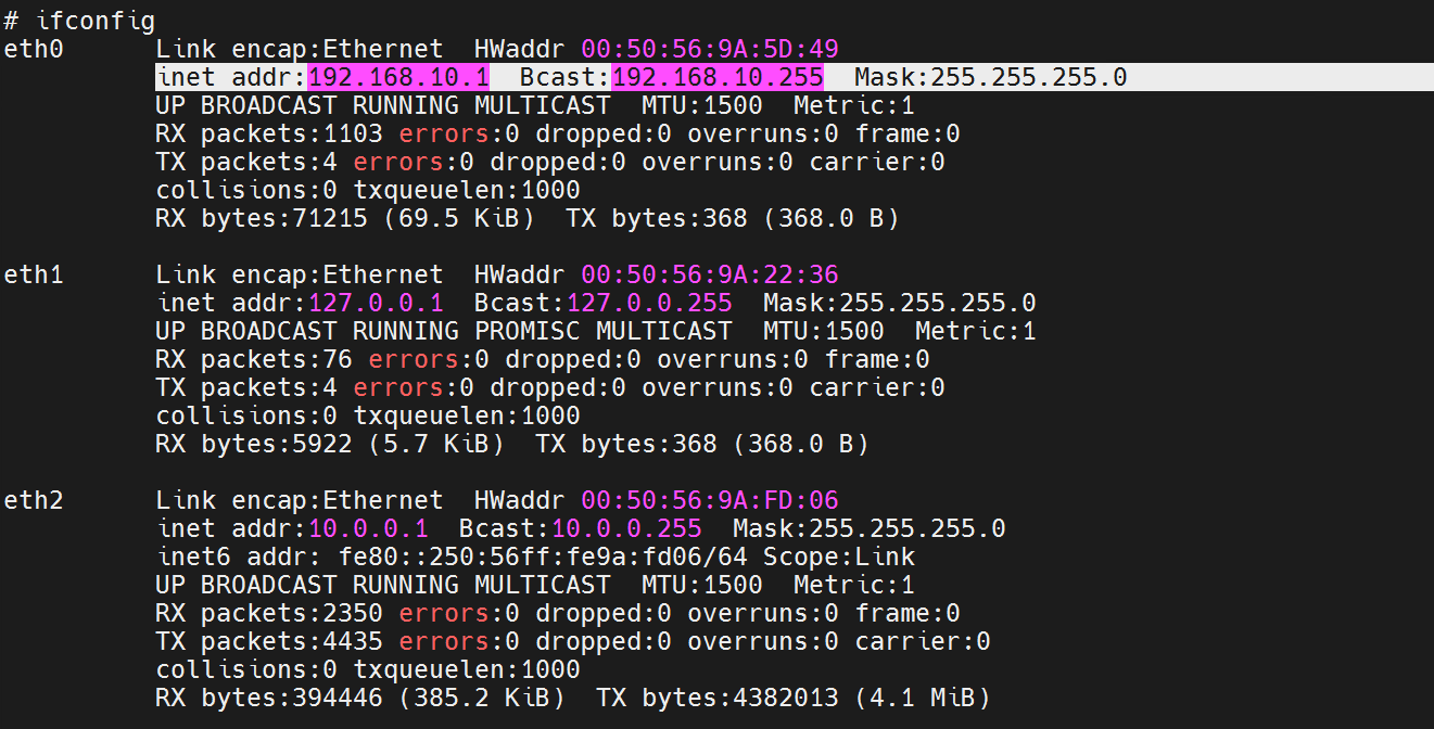 다시 ifconfig를 했을 때 각 인터페이스에 IPv4 주소가 추가된 것을 확인할 수 있음