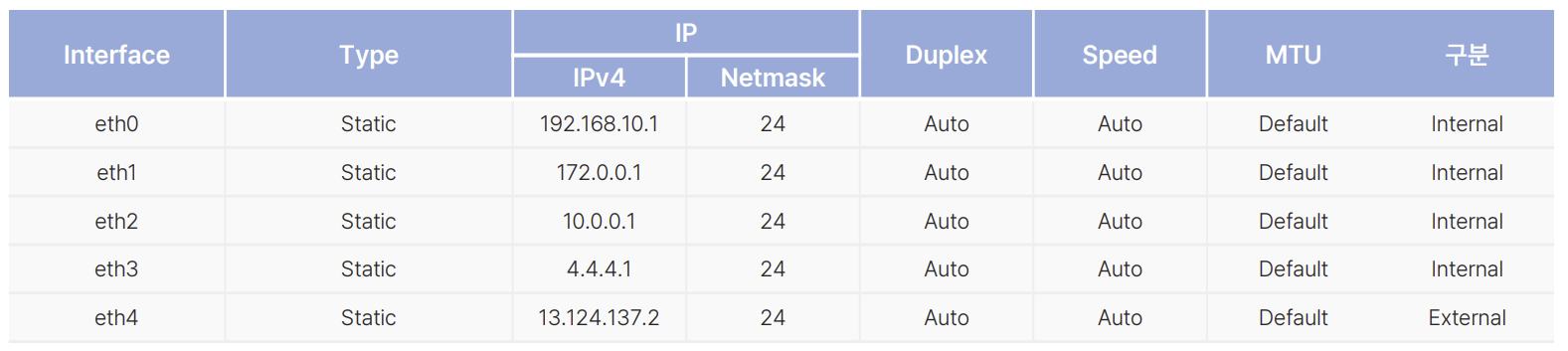 기존에 설정되어 있던 eth2를 제외한 나머지 네트워크 인터페이스를 아래 표와 같이 할당하기
