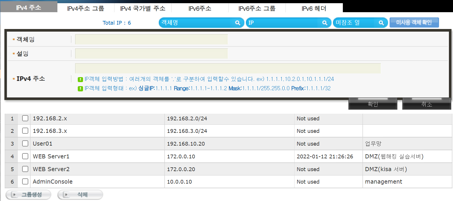 객체는 이후 보안정책 설정 시 편리하게 등록할 수 있도록 도와준다.