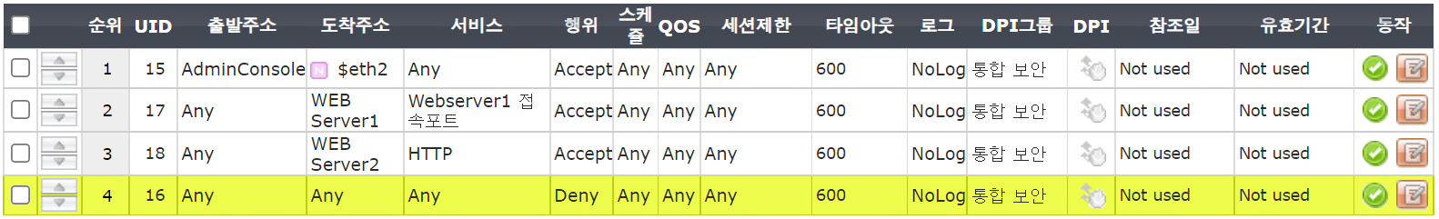 - 도착주소 eth2는 AdminConsole에서만 접근 가능하도록 Accept 하고 기존 필터링은 삭제