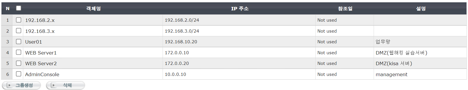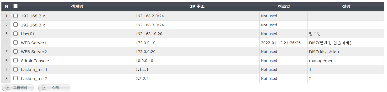백업 전/후를 비교하기 위해 backup_test1, backup_test2라는 객체를 새로 생성하였고 정책 전송을 눌러 저장한다.