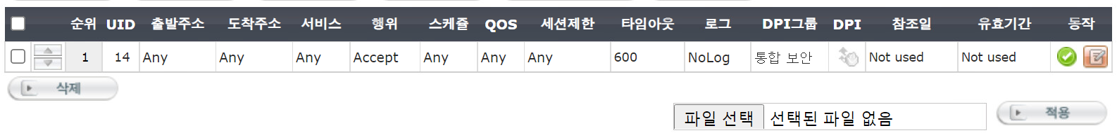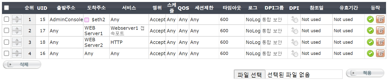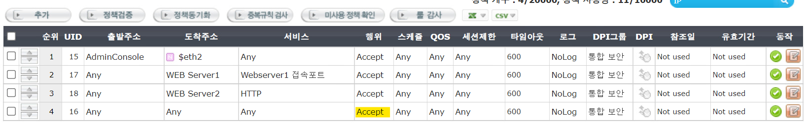 모든 주소와 서비스를 Deny 하는 4순위 정책을 Accept로 수정