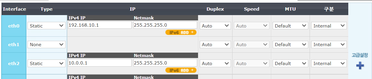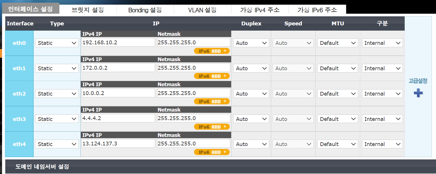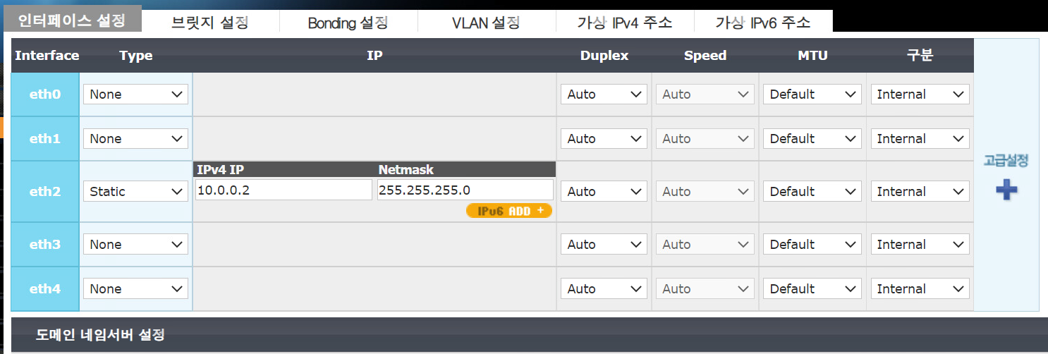 인터페이스 설정에 들어가 eth1번의 Type을 Static -> None으로 변경하면